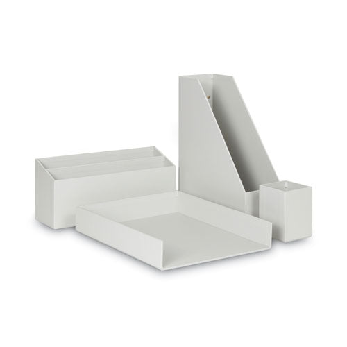 - Desktop set includes coordinated storage bin, magazine file, paper tray and pencil cup