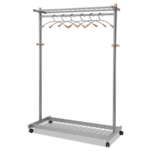 Garment Racks, Two-Sided, 2-Shelf Coat Rack, 6 Hanger/6 Hook, 44.8w x 21.67d x 70.8h, Silver/Wood-(ABAPMLUX6)