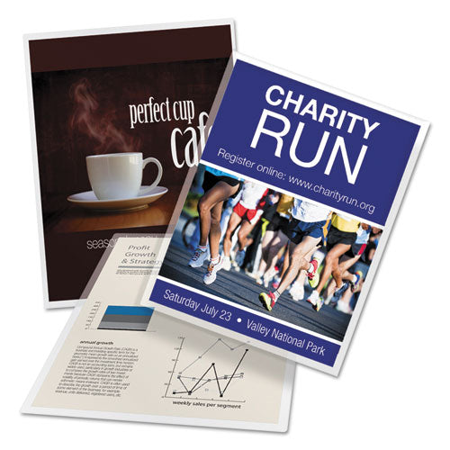 - Standard, glossy finish thermal laminating pouch delivers brilliantly clear results